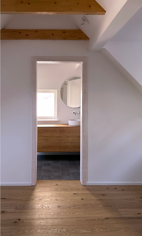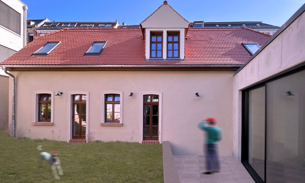 Das um 1860 errichtete Gebäude wurde umfassend saniert, modernisiert und umgebaut. Die über die Jahre entstandenen Anbauten wurden rückgebaut, um die ursprüngliche Silhouette des Krüppelwalmdachs wieder sichtbar zu machen. Ergänzt wurde das Haus durch einen zurückhaltenden Betonanbau, der tiefer gesetzt wurde, um die Trauflinie des Bestandsgebäudes nicht zu unterbrechen. Der Anbau bildet einen modernen Kontrast zur historischen Fassade und schafft im Inneren einen hellen großzügige Raum mit direktem Bezug zum Garten.